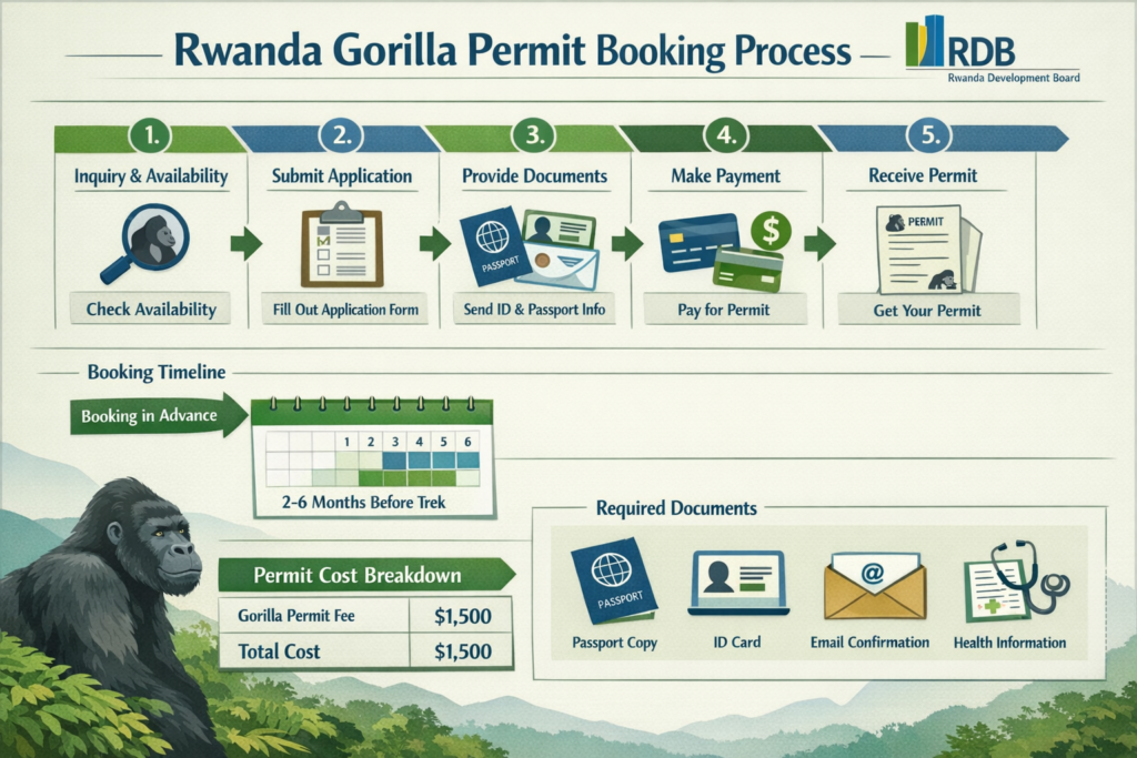 Direct booking through the Rwanda Development Board requires specific documentation and payment procedures. The process involves several steps that must be completed in sequence.